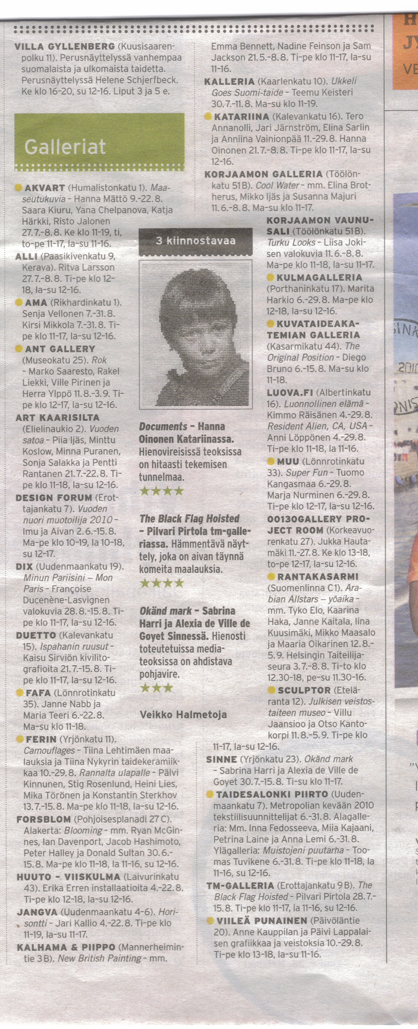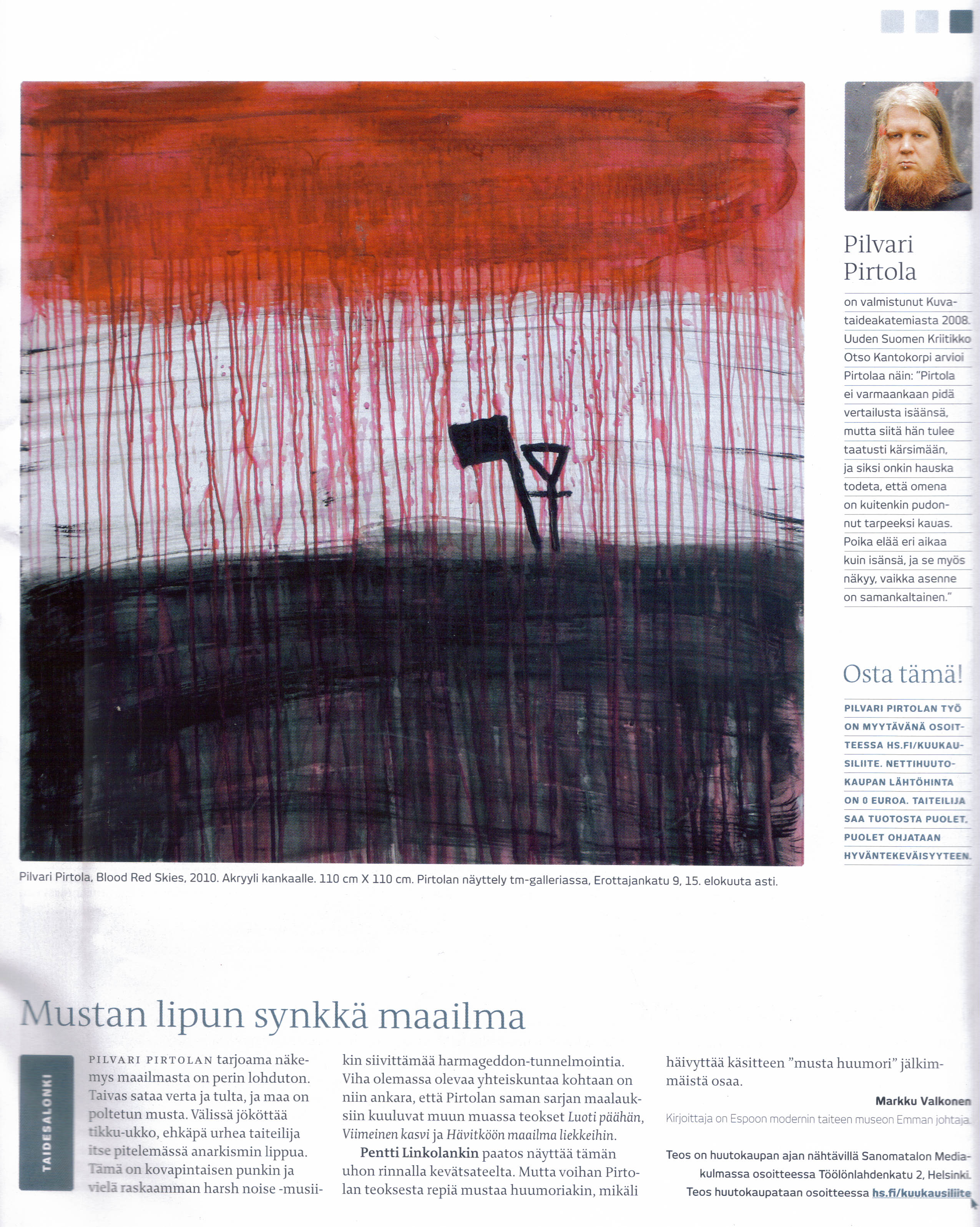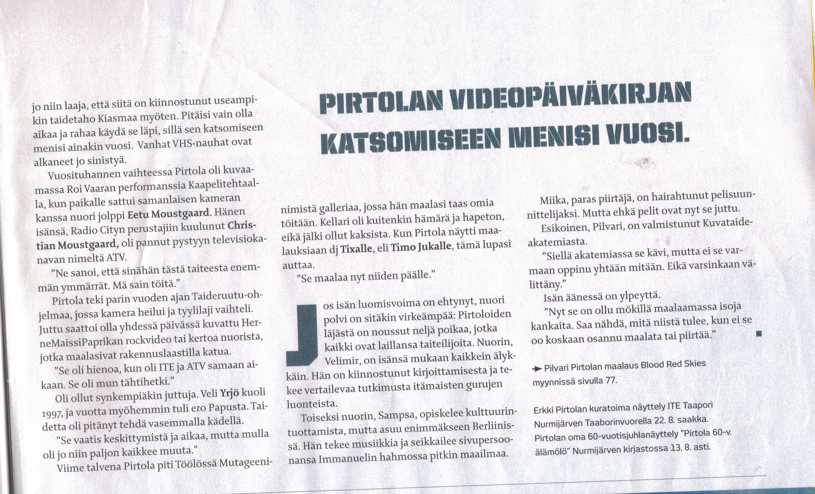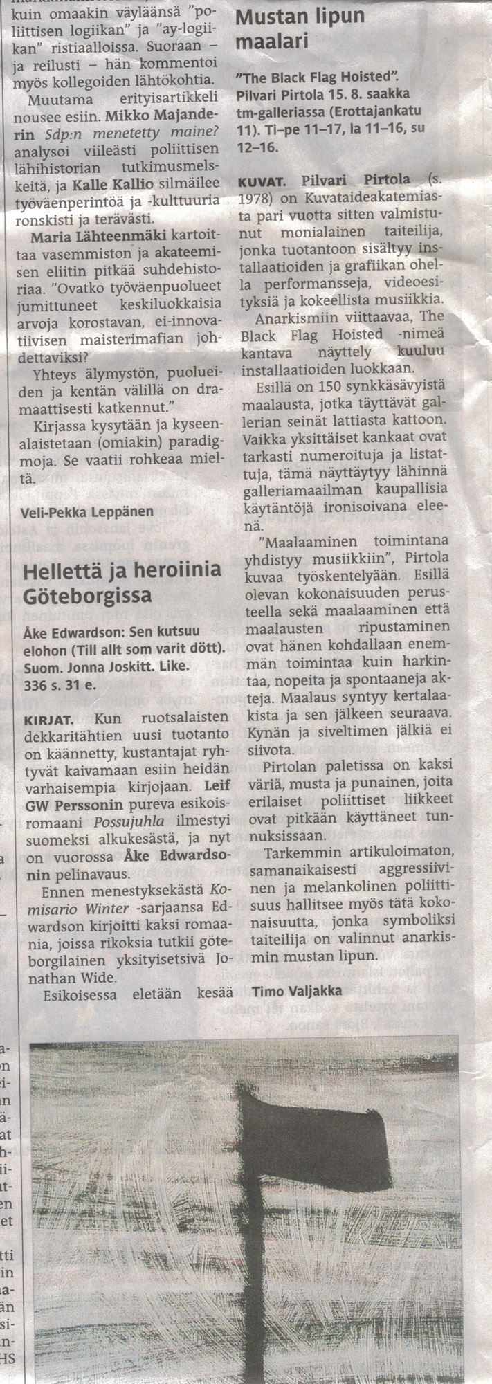 my graduation work "I Was Ready To Leave a Long Time Ago" at Tennispalatsi Art Museum spring 2008 MFA work at Tennispalatsi Art Museum, article in Helsingin Sanomat by Marja-Terttu Kivirinta 27.5.2008 HS 27.5.2008 web article My graduation work at mentioned at Kronikka Jos seinät osaisivat puhua, botkyrka konsthall & kerava art museum 2007 TAIDE 5/08 Jos seinät osaisivat puhua some mail ad my residency time at Taidekeskus Salmela fall 2008 lansi-savo pitajanuutiset1 pitajanuutiset2 Kouvolan sanomat 6.12.2008 Kouvolan sanomat 6.12.2008 & lansi-savo 4.12.2008 Pitäjän uutiset 16.12.2008 set the world to flames http://aurinsusi.tumblr.com/post/9465780685/i-went-to-mr-pirtolas-set-the-world-to-flames http://www.olivialehti.fi/Blogit/Nelliinanvaatehuone/tabid/345/Default.aspx?PostId=9471 http://nokkonen.wordpress.com/2011/09/04/mielensisainen-nayttely-pirtola/ Tamperelainen 24.08.2011 http://www.lehtiluukku.fi/pub?id=12101 http://www.aamulehti.fi/xTapahtumatNayttelyt/1194695570278/artikkeli/pilvari+nosfe+pirtola+maalaa+kuin+viimeista+paivaa.html demowall 2011 http://www.digiluovuus.fi/demowall-helsinki-2011-myohaisillan-mielipite me haluamme näyttää sen mikä on kaikkialla at Ateneum Art Museum october 2008 april 2009 KAS 2/08 - our exhibition advertized here scan of the article in kas Tulevaisuuden taidemuseo on koko maailma @HS web version tulevaisuuden taidemuseo @kulttuurinavigaattori tulevaisuuden taidemuseo @sohvapakolainen tulevaisuuden taidemuseo book -pics of the work made by me and jaakko karhunen published there review of the book http://www.fng.fi/instancedata/prime_product_julkaisu/vtm/embeds/vtmwwwstructure/15940_VTM_Juhlakirja_verkkoversio.pdf excession january/february 2008 Räimettä ja kierrätystä, Otso Kantokorpi@Uusi Suomi 29.1.2008 blood red skies at Kuukausiliite august 2010 blood red skies reviewed at HS Kuukausiliite by Markku Valkonen scan of the article from paper the black flag hoisted 28.7.-15.8.2010 black flag hoisted reviewed at HS by Timo Valjakka scan of the hs article black flag hoisted reviewed at city.fi by Maria Pettersson black flag hoisted reviewed at Suomen Kuvalehti blog by Karri Kokko black flag hoisted reviewed at mustakala.info black flag hoisted mentioned at nayttelyinfo nyt-liite 6.8.2010 helsingin sanomat 7.8.2010 a lengthy article about my dad was on Kuukausiliite 8/2010, my exhibition was sort of mentioned there so here it is: 1 2 3 4 5 6 pics of the show at picasa mennään metsään - group exhibition of Helsigin taiteilijaseura summer 2010 mennään metsään at nayttelyinfo kesätunelmia metsässä. kansanuutiset 2.7.2010 Taiteilijat menivät metsään - uutislehti demari 12.7.2010 olen sosialisti-anarkisti-individuaali-kollektivisti-kommunisti-aristokraatti-demokraatti spring 2010 hameensanomat .Olen sosialisti-anarkisti-individuaali-kollektivisti-individualisti-kommunisti-aristokraatti-demokraatti. @curec hämeenlinnan kaupunki article about jyrki riekki on länsi-uusimaa which also mentions the exhibition ad on verkatehdas press release small mention on ota ry blog apuraha laittaa teokset kiertämään -ilkka 10.02.2010 taide 2/10 numero1.10 pics of my work at the show at picasa toka osa: keskisuomalainen city? http://www.teatteritanssi.fi/4804-sattuman-lapsi/ http://kweku.de/category/english/ http://www.galerielehtinen.com/index.php?/past/2012-fixc-co-operative/ http://artbytonihautamaki.blogspot.fi/ http://sanniseppa.blogspot.fi/2012_08_01_archive.html http://www.kirkkojakaupunki.fi/kulttuuri/taidetta-sairaille http://www.ilmestykset.net/2012/03/hapeamaton-valmistui/ http://stefan.suomessa.eu/class-photo/ framework 2/2004, innovation and social space, page 136 http://artinpublicspheres.files.wordpress.com/2010/09/framework-innovation-and-social-space.pdf things i haven't seen at malmitalo Vartti http://inthislightandonthisevening.blogspot.com/2011/02/luku-47.html nyt hs hbl1 http://yle.fi/alueet/helsinki/2011/07/katastrofiolojen_taidetta_pakolaissuojassa_2736226.html http://leenahan.blogspot.com/2011/02/pilvari-piirtola-raivoaa-ja-satu-virne.html siikosen talo hyvinkään viikkoposti hyvinkään aamulehti http://rajalaphotography.blogspot.com/2011/02/friday-artexhibition.html http://koti.kontu.la/aahonen/oma/2005/01/25/2005-01-25.htm https://publications.theseus.fi/handle/10024/32542 demowall - night of the arts 2009 demowall at plaza.fi edome demowall demowall at m2hz demowall on itviikko demowall2 on itviikko demowallpressrelease at kauppalehtigrants