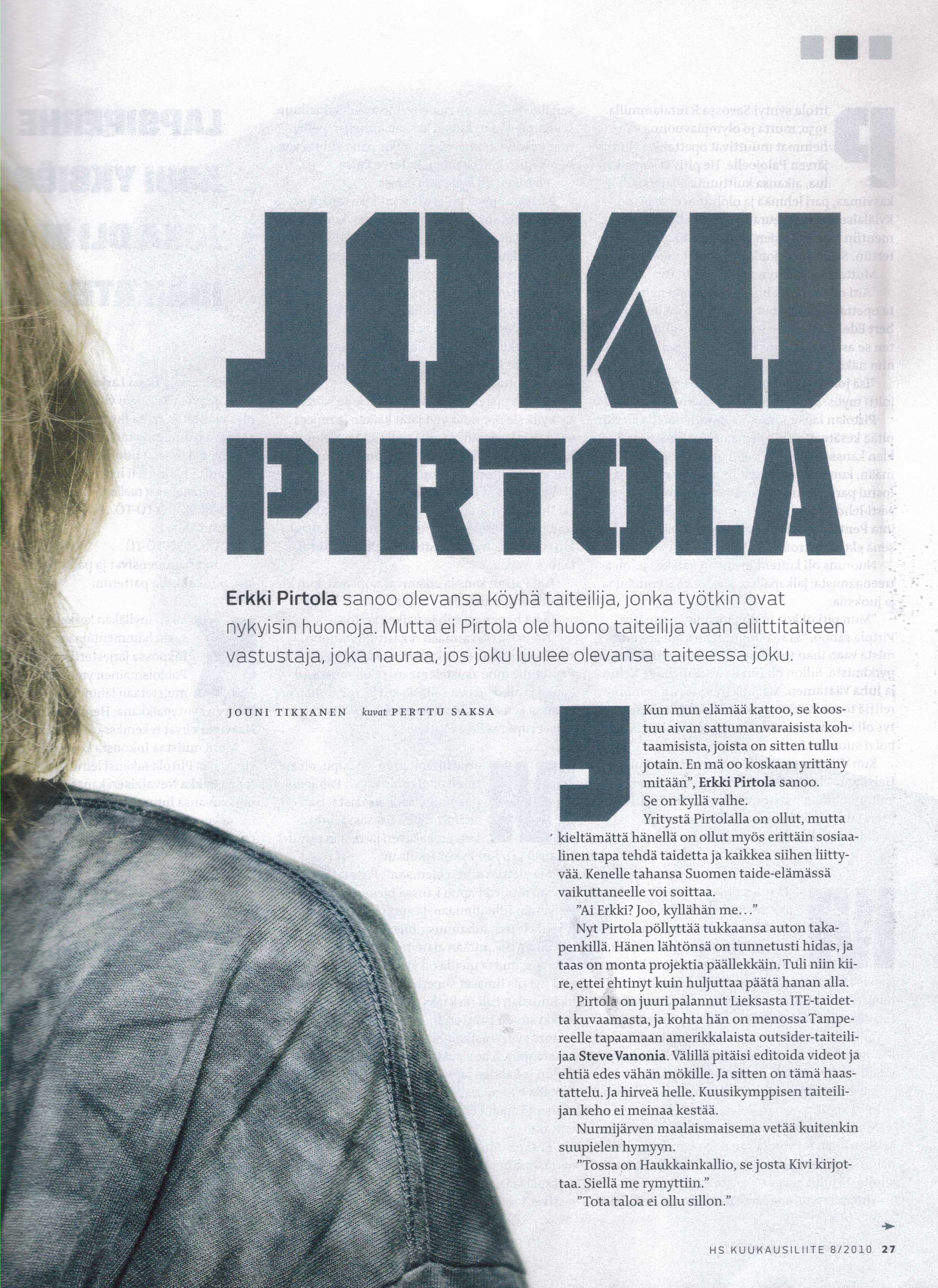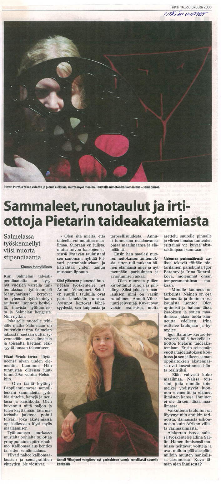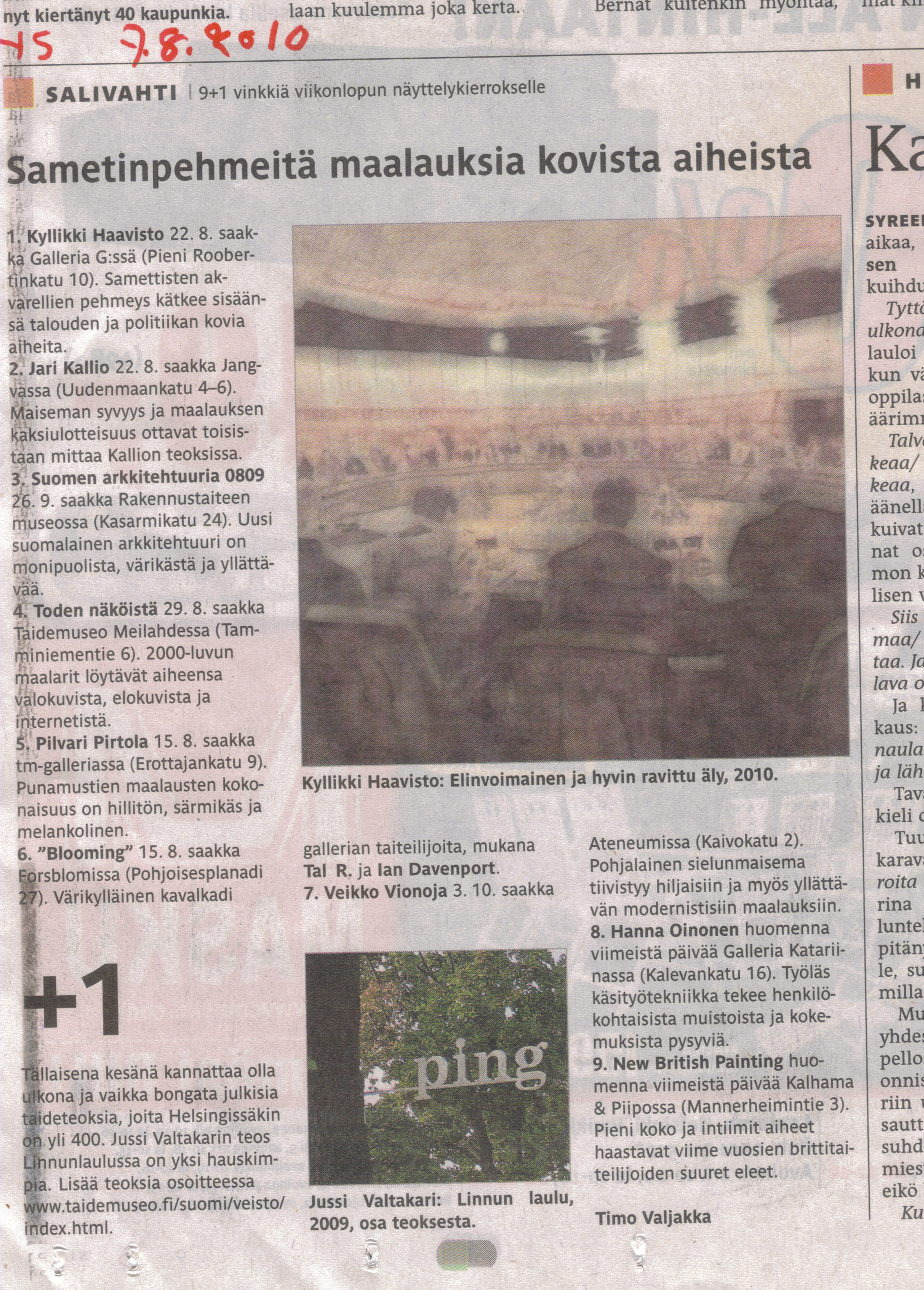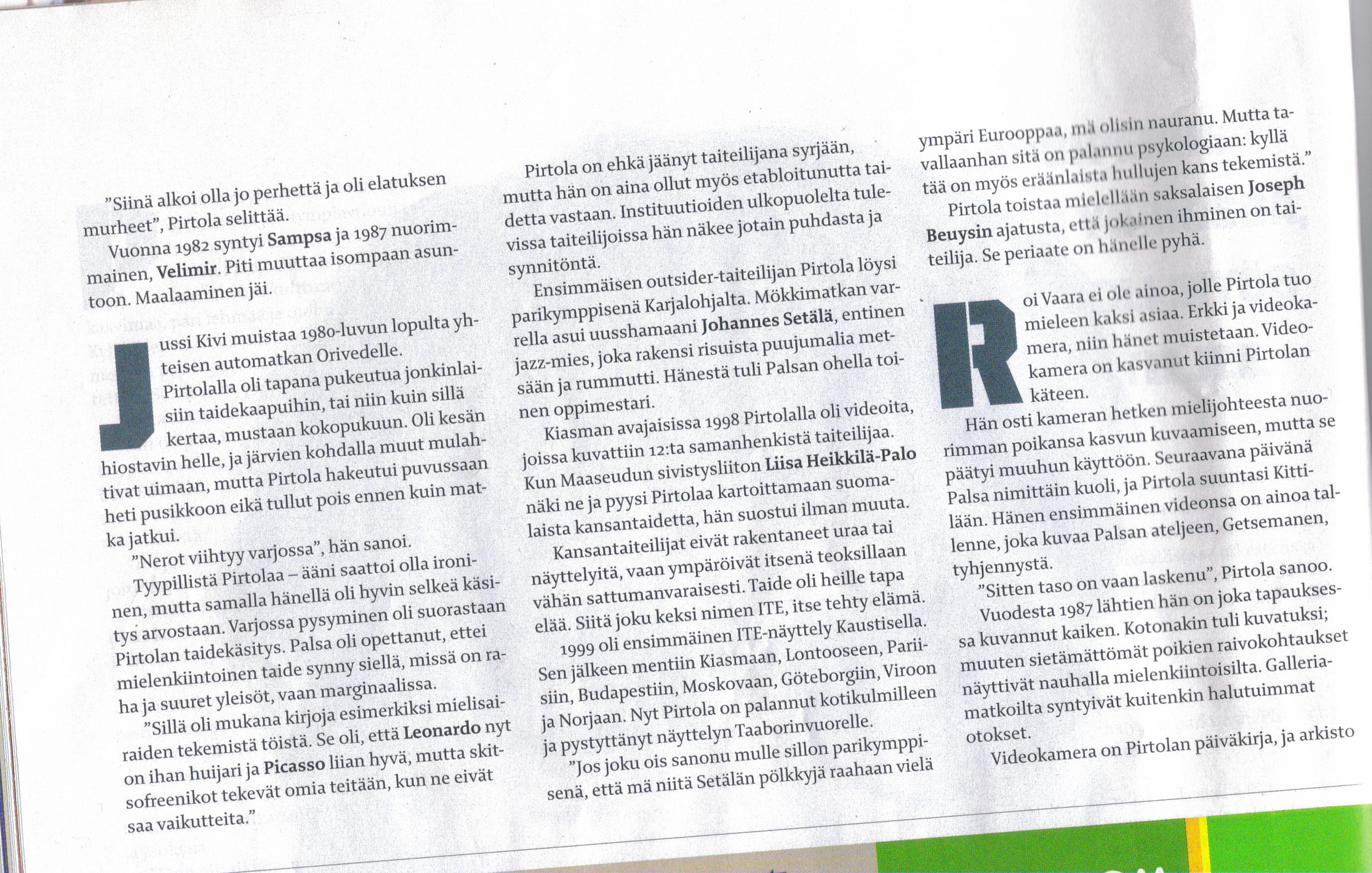 my graduation work "I Was Ready To Leave a Long Time Ago" at Tennispalatsi Art Museum spring 2008 MFA work at Tennispalatsi Art Museum, article in Helsingin Sanomat by Marja-Terttu Kivirinta 27.5.2008 HS 27.5.2008 web article My graduation work at mentioned at Kronikka Jos seinät osaisivat puhua, botkyrka konsthall & kerava art museum 2007 TAIDE 5/08 Jos seinät osaisivat puhua some mail ad my residency time at Taidekeskus Salmela fall 2008 lansi-savo pitajanuutiset1 pitajanuutiset2 Kouvolan sanomat 6.12.2008 Kouvolan sanomat 6.12.2008 & lansi-savo 4.12.2008 Pitäjän uutiset 16.12.2008 set the world to flames http://aurinsusi.tumblr.com/post/9465780685/i-went-to-mr-pirtolas-set-the-world-to-flames http://www.olivialehti.fi/Blogit/Nelliinanvaatehuone/tabid/345/Default.aspx?PostId=9471 http://nokkonen.wordpress.com/2011/09/04/mielensisainen-nayttely-pirtola/ Tamperelainen 24.08.2011 http://www.lehtiluukku.fi/pub?id=12101 http://www.aamulehti.fi/xTapahtumatNayttelyt/1194695570278/artikkeli/pilvari+nosfe+pirtola+maalaa+kuin+viimeista+paivaa.html demowall 2011 http://www.digiluovuus.fi/demowall-helsinki-2011-myohaisillan-mielipite me haluamme näyttää sen mikä on kaikkialla at Ateneum Art Museum october 2008 april 2009 KAS 2/08 - our exhibition advertized here scan of the article in kas Tulevaisuuden taidemuseo on koko maailma @HS web version tulevaisuuden taidemuseo @kulttuurinavigaattori tulevaisuuden taidemuseo @sohvapakolainen tulevaisuuden taidemuseo book -pics of the work made by me and jaakko karhunen published there review of the book http://www.fng.fi/instancedata/prime_product_julkaisu/vtm/embeds/vtmwwwstructure/15940_VTM_Juhlakirja_verkkoversio.pdf excession january/february 2008 Räimettä ja kierrätystä, Otso Kantokorpi@Uusi Suomi 29.1.2008 blood red skies at Kuukausiliite august 2010 blood red skies reviewed at HS Kuukausiliite by Markku Valkonen scan of the article from paper the black flag hoisted 28.7.-15.8.2010 black flag hoisted reviewed at HS by Timo Valjakka scan of the hs article black flag hoisted reviewed at city.fi by Maria Pettersson black flag hoisted reviewed at Suomen Kuvalehti blog by Karri Kokko black flag hoisted reviewed at mustakala.info black flag hoisted mentioned at nayttelyinfo nyt-liite 6.8.2010 helsingin sanomat 7.8.2010 a lengthy article about my dad was on Kuukausiliite 8/2010, my exhibition was sort of mentioned there so here it is: 1 2 3 4 5 6 pics of the show at picasa mennään metsään - group exhibition of Helsigin taiteilijaseura summer 2010 mennään metsään at nayttelyinfo kesätunelmia metsässä. kansanuutiset 2.7.2010 Taiteilijat menivät metsään - uutislehti demari 12.7.2010 olen sosialisti-anarkisti-individuaali-kollektivisti-kommunisti-aristokraatti-demokraatti spring 2010 hameensanomat .Olen sosialisti-anarkisti-individuaali-kollektivisti-individualisti-kommunisti-aristokraatti-demokraatti. @curec hämeenlinnan kaupunki article about jyrki riekki on länsi-uusimaa which also mentions the exhibition ad on verkatehdas press release small mention on ota ry blog apuraha laittaa teokset kiertämään -ilkka 10.02.2010 taide 2/10 numero1.10 pics of my work at the show at picasa toka osa: keskisuomalainen city? http://www.teatteritanssi.fi/4804-sattuman-lapsi/ http://kweku.de/category/english/ http://www.galerielehtinen.com/index.php?/past/2012-fixc-co-operative/ http://artbytonihautamaki.blogspot.fi/ http://sanniseppa.blogspot.fi/2012_08_01_archive.html http://www.kirkkojakaupunki.fi/kulttuuri/taidetta-sairaille http://www.ilmestykset.net/2012/03/hapeamaton-valmistui/ http://stefan.suomessa.eu/class-photo/ framework 2/2004, innovation and social space, page 136 http://artinpublicspheres.files.wordpress.com/2010/09/framework-innovation-and-social-space.pdf things i haven't seen at malmitalo Vartti http://inthislightandonthisevening.blogspot.com/2011/02/luku-47.html nyt hs hbl1 http://yle.fi/alueet/helsinki/2011/07/katastrofiolojen_taidetta_pakolaissuojassa_2736226.html http://leenahan.blogspot.com/2011/02/pilvari-piirtola-raivoaa-ja-satu-virne.html siikosen talo hyvinkään viikkoposti hyvinkään aamulehti http://rajalaphotography.blogspot.com/2011/02/friday-artexhibition.html http://koti.kontu.la/aahonen/oma/2005/01/25/2005-01-25.htm https://publications.theseus.fi/handle/10024/32542 demowall - night of the arts 2009 demowall at plaza.fi edome demowall demowall at m2hz demowall on itviikko demowall2 on itviikko demowallpressrelease at kauppalehtigrants