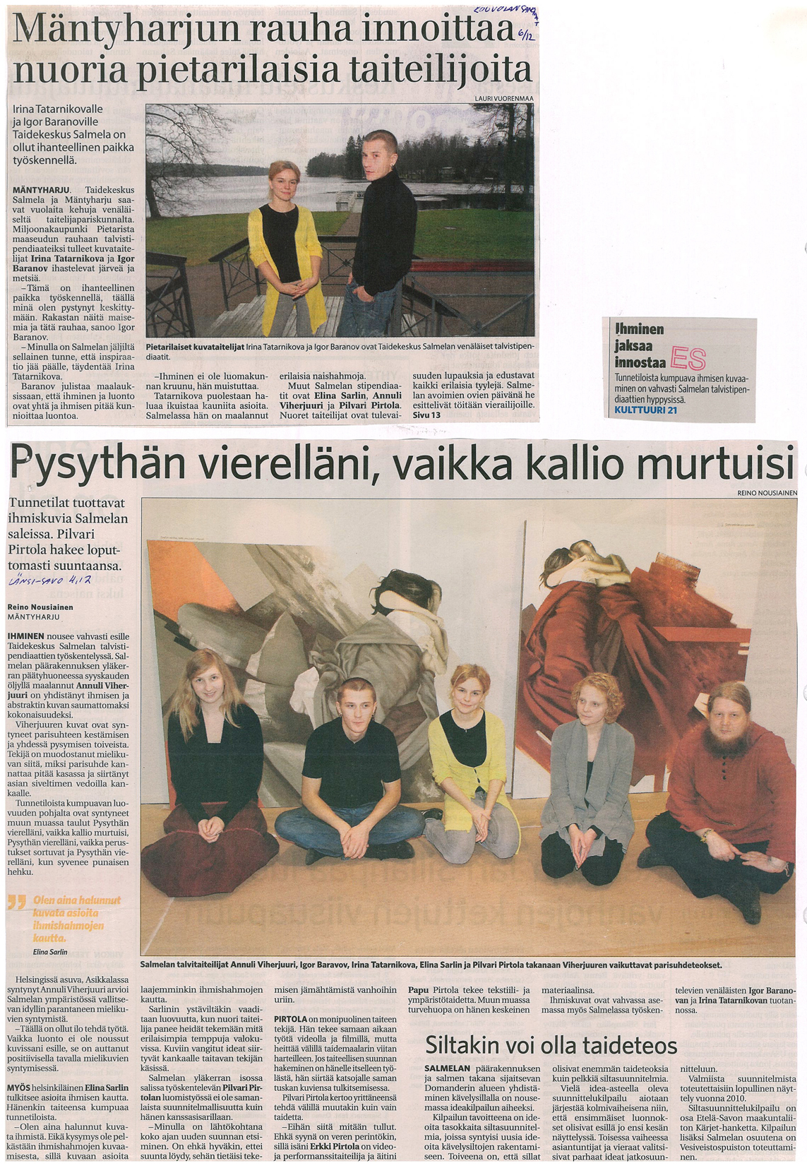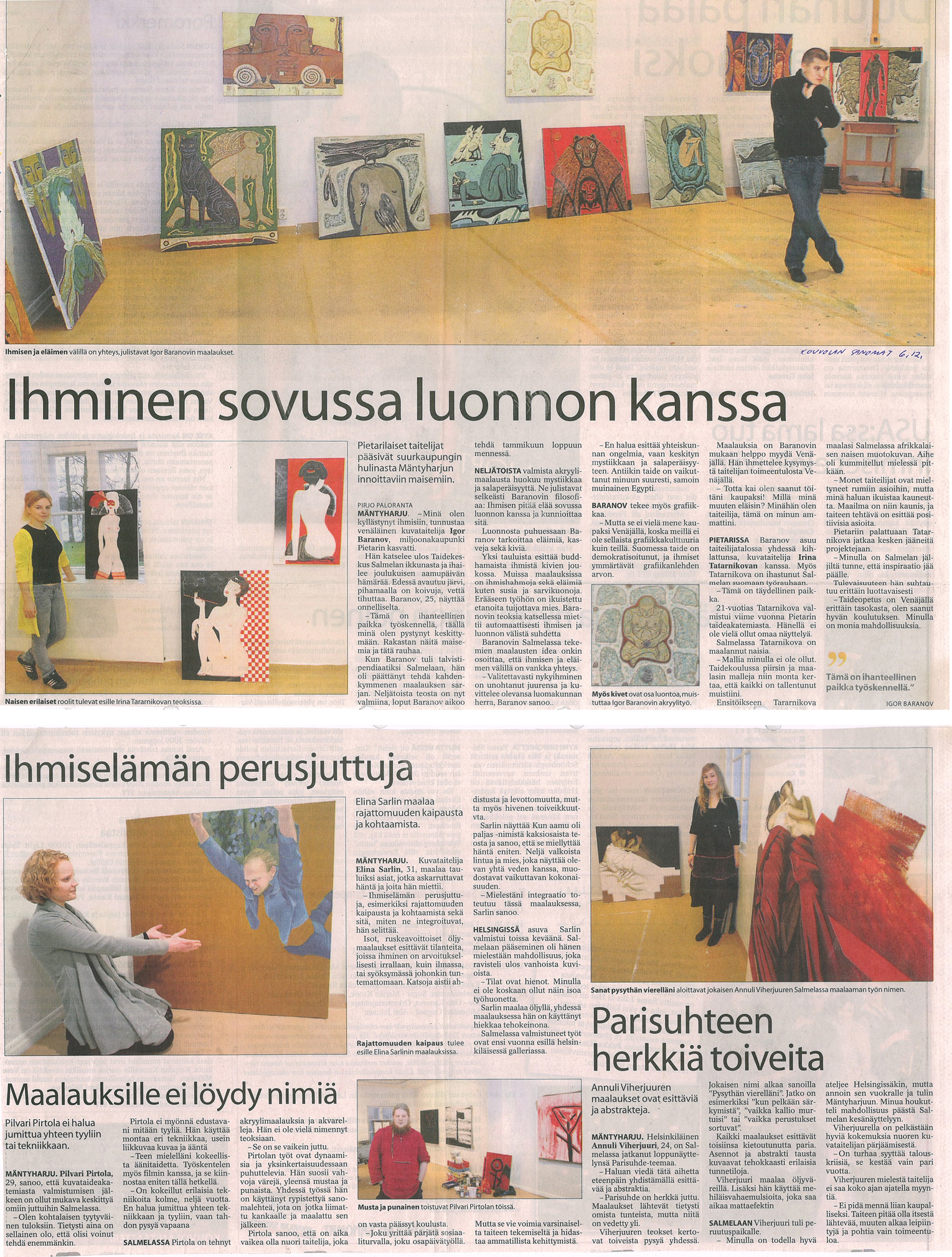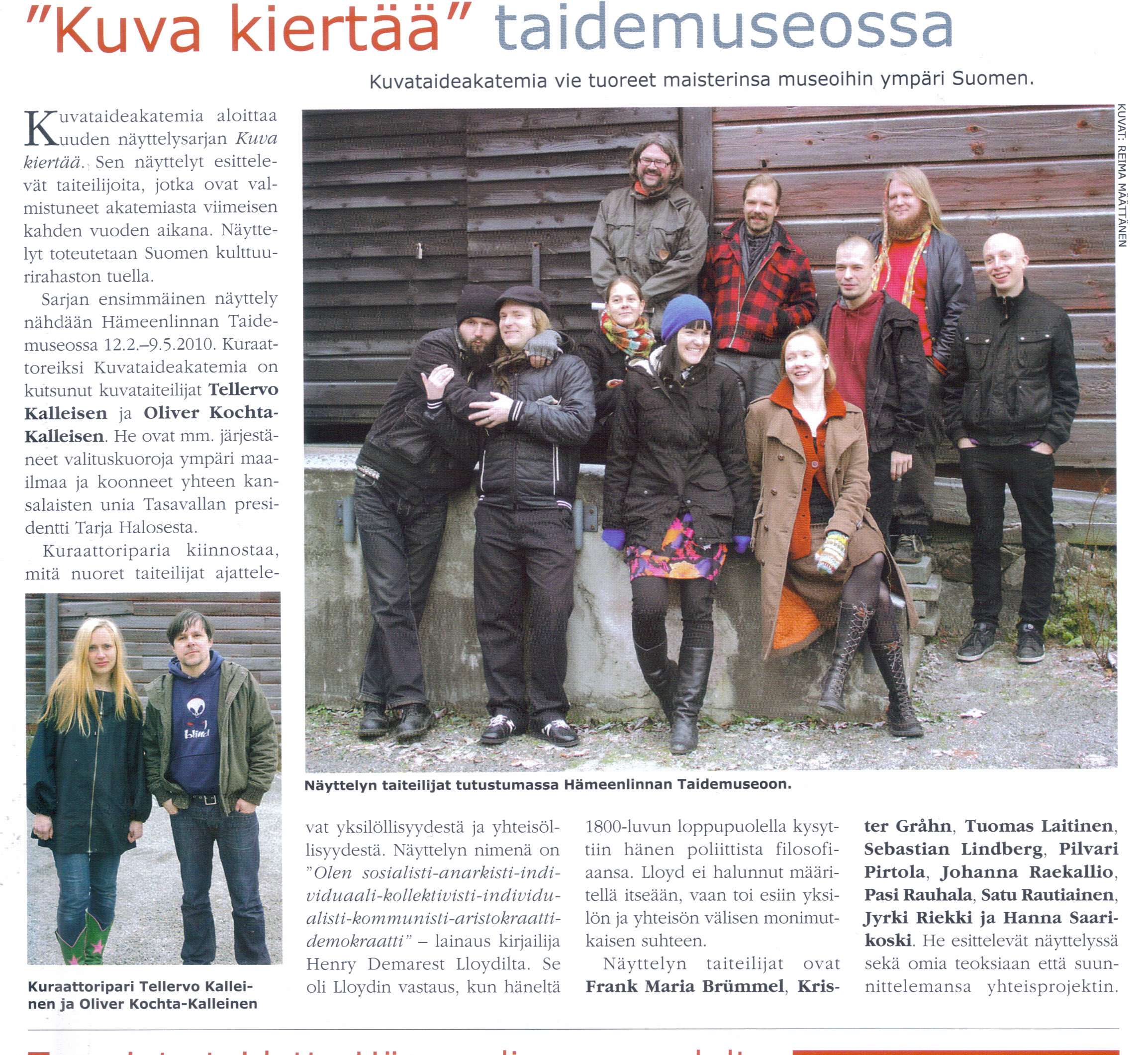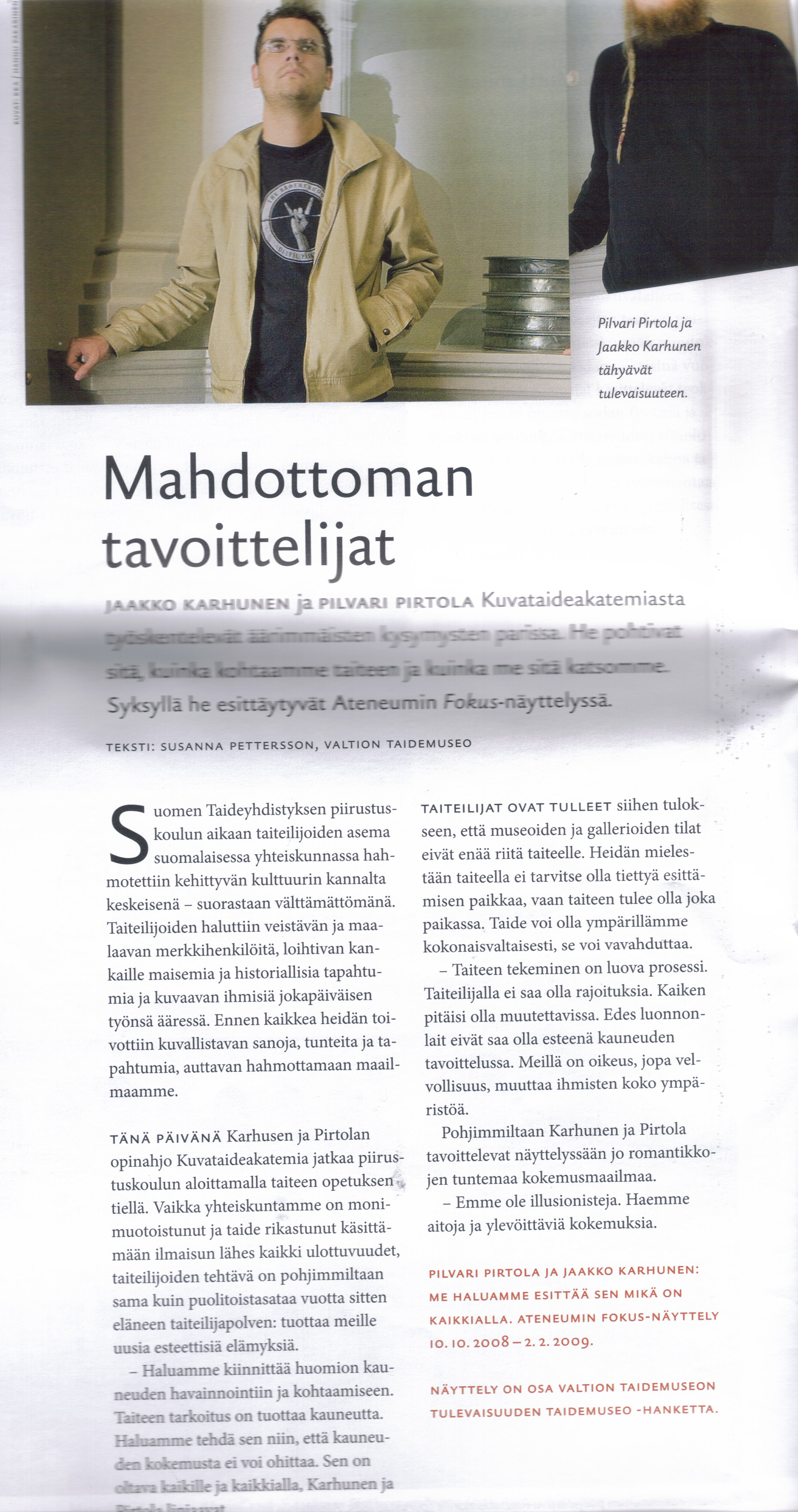 my graduation work "I Was Ready To Leave a Long Time Ago" at Tennispalatsi Art Museum spring 2008 MFA work at Tennispalatsi Art Museum, article in Helsingin Sanomat by Marja-Terttu Kivirinta 27.5.2008 HS 27.5.2008 web article My graduation work at mentioned at Kronikka Jos seinät osaisivat puhua, botkyrka konsthall & kerava art museum 2007 TAIDE 5/08 Jos seinät osaisivat puhua some mail ad my residency time at Taidekeskus Salmela fall 2008 lansi-savo pitajanuutiset1 pitajanuutiset2 Kouvolan sanomat 6.12.2008 Kouvolan sanomat 6.12.2008 & lansi-savo 4.12.2008 Pitäjän uutiset 16.12.2008 set the world to flames http://aurinsusi.tumblr.com/post/9465780685/i-went-to-mr-pirtolas-set-the-world-to-flames http://www.olivialehti.fi/Blogit/Nelliinanvaatehuone/tabid/345/Default.aspx?PostId=9471 http://nokkonen.wordpress.com/2011/09/04/mielensisainen-nayttely-pirtola/ Tamperelainen 24.08.2011 http://www.lehtiluukku.fi/pub?id=12101 http://www.aamulehti.fi/xTapahtumatNayttelyt/1194695570278/artikkeli/pilvari+nosfe+pirtola+maalaa+kuin+viimeista+paivaa.html demowall 2011 http://www.digiluovuus.fi/demowall-helsinki-2011-myohaisillan-mielipite me haluamme näyttää sen mikä on kaikkialla at Ateneum Art Museum october 2008 april 2009 KAS 2/08 - our exhibition advertized here scan of the article in kas Tulevaisuuden taidemuseo on koko maailma @HS web version tulevaisuuden taidemuseo @kulttuurinavigaattori tulevaisuuden taidemuseo @sohvapakolainen tulevaisuuden taidemuseo book -pics of the work made by me and jaakko karhunen published there review of the book http://www.fng.fi/instancedata/prime_product_julkaisu/vtm/embeds/vtmwwwstructure/15940_VTM_Juhlakirja_verkkoversio.pdf excession january/february 2008 Räimettä ja kierrätystä, Otso Kantokorpi@Uusi Suomi 29.1.2008 blood red skies at Kuukausiliite august 2010 blood red skies reviewed at HS Kuukausiliite by Markku Valkonen scan of the article from paper the black flag hoisted 28.7.-15.8.2010 black flag hoisted reviewed at HS by Timo Valjakka scan of the hs article black flag hoisted reviewed at city.fi by Maria Pettersson black flag hoisted reviewed at Suomen Kuvalehti blog by Karri Kokko black flag hoisted reviewed at mustakala.info black flag hoisted mentioned at nayttelyinfo nyt-liite 6.8.2010 helsingin sanomat 7.8.2010 a lengthy article about my dad was on Kuukausiliite 8/2010, my exhibition was sort of mentioned there so here it is: 1 2 3 4 5 6 pics of the show at picasa mennään metsään - group exhibition of Helsigin taiteilijaseura summer 2010 mennään metsään at nayttelyinfo kesätunelmia metsässä. kansanuutiset 2.7.2010 Taiteilijat menivät metsään - uutislehti demari 12.7.2010 olen sosialisti-anarkisti-individuaali-kollektivisti-kommunisti-aristokraatti-demokraatti spring 2010 hameensanomat .Olen sosialisti-anarkisti-individuaali-kollektivisti-individualisti-kommunisti-aristokraatti-demokraatti. @curec hämeenlinnan kaupunki article about jyrki riekki on länsi-uusimaa which also mentions the exhibition ad on verkatehdas press release small mention on ota ry blog apuraha laittaa teokset kiertämään -ilkka 10.02.2010 taide 2/10 numero1.10 pics of my work at the show at picasa toka osa: keskisuomalainen city? http://www.teatteritanssi.fi/4804-sattuman-lapsi/ http://kweku.de/category/english/ http://www.galerielehtinen.com/index.php?/past/2012-fixc-co-operative/ http://artbytonihautamaki.blogspot.fi/ http://sanniseppa.blogspot.fi/2012_08_01_archive.html http://www.kirkkojakaupunki.fi/kulttuuri/taidetta-sairaille http://www.ilmestykset.net/2012/03/hapeamaton-valmistui/ http://stefan.suomessa.eu/class-photo/ framework 2/2004, innovation and social space, page 136 http://artinpublicspheres.files.wordpress.com/2010/09/framework-innovation-and-social-space.pdf things i haven't seen at malmitalo Vartti http://inthislightandonthisevening.blogspot.com/2011/02/luku-47.html nyt hs hbl1 http://yle.fi/alueet/helsinki/2011/07/katastrofiolojen_taidetta_pakolaissuojassa_2736226.html http://leenahan.blogspot.com/2011/02/pilvari-piirtola-raivoaa-ja-satu-virne.html siikosen talo hyvinkään viikkoposti hyvinkään aamulehti http://rajalaphotography.blogspot.com/2011/02/friday-artexhibition.html http://koti.kontu.la/aahonen/oma/2005/01/25/2005-01-25.htm https://publications.theseus.fi/handle/10024/32542 demowall - night of the arts 2009 demowall at plaza.fi edome demowall demowall at m2hz demowall on itviikko demowall2 on itviikko demowallpressrelease at kauppalehtigrants